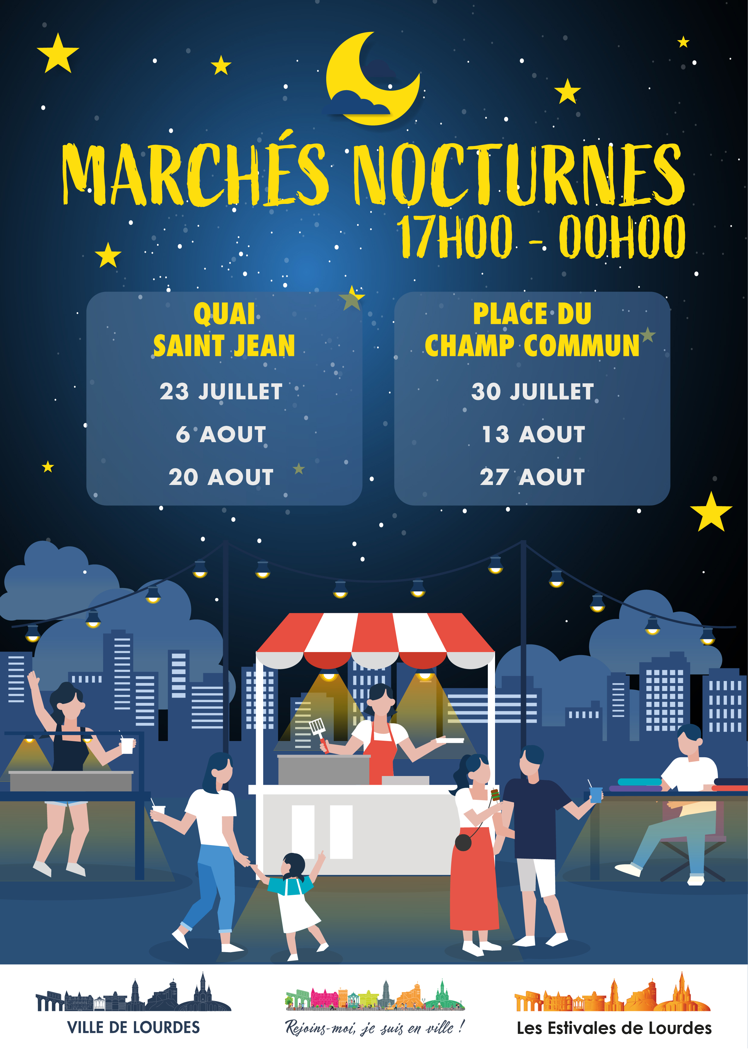 Sous l’impulsion de Julien Lemaitre Conseiller municipal délégué, le Service commerce et développement de la Ville de Lourdes propose dans le cadre de la programmation Les Estivales de Lourdes des marchés nocturnes hebdomadaires qui se dérouleront alternativement entre le quai Saint Jean et la place du Champ commun de 17h à 00h00.